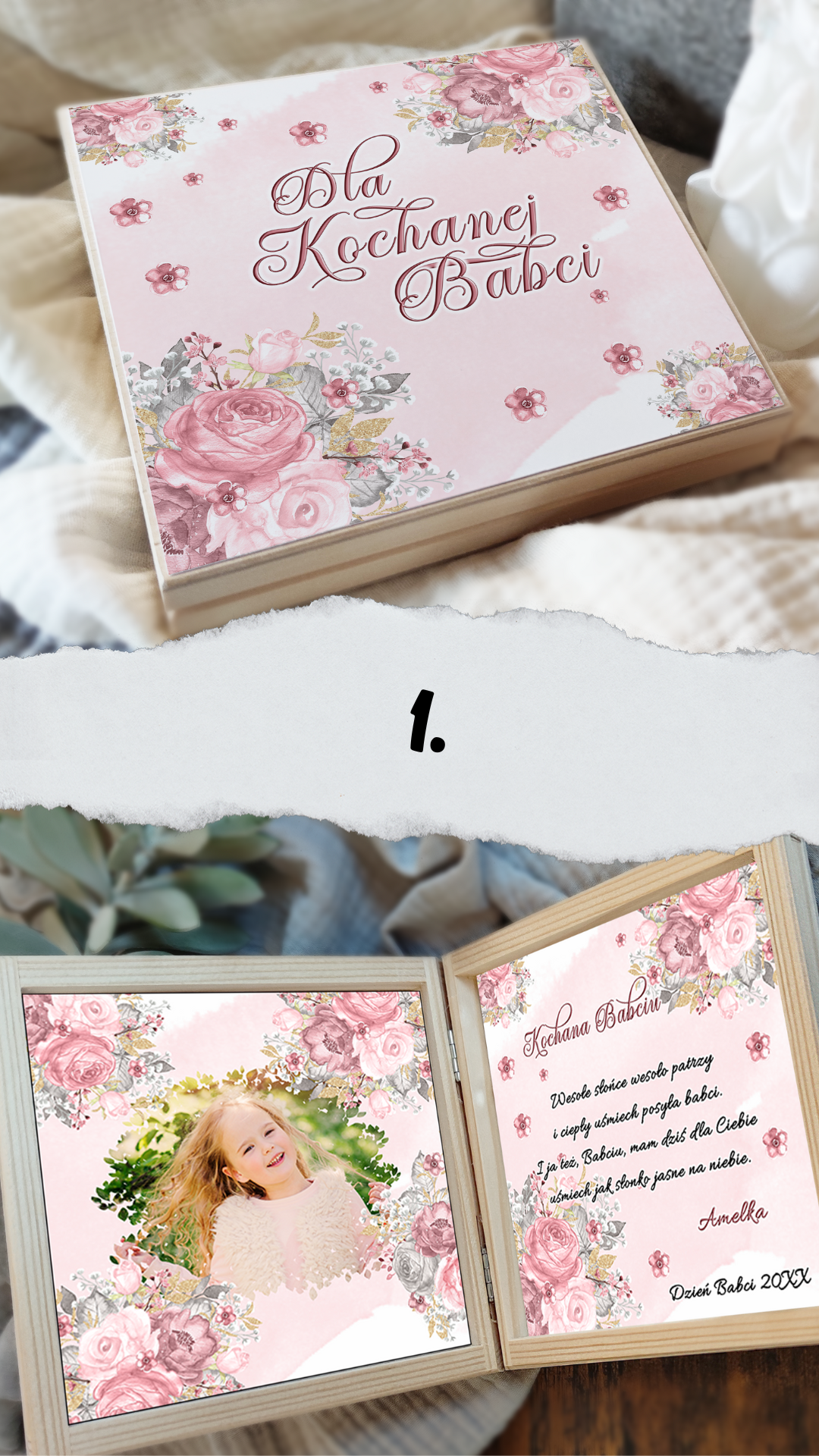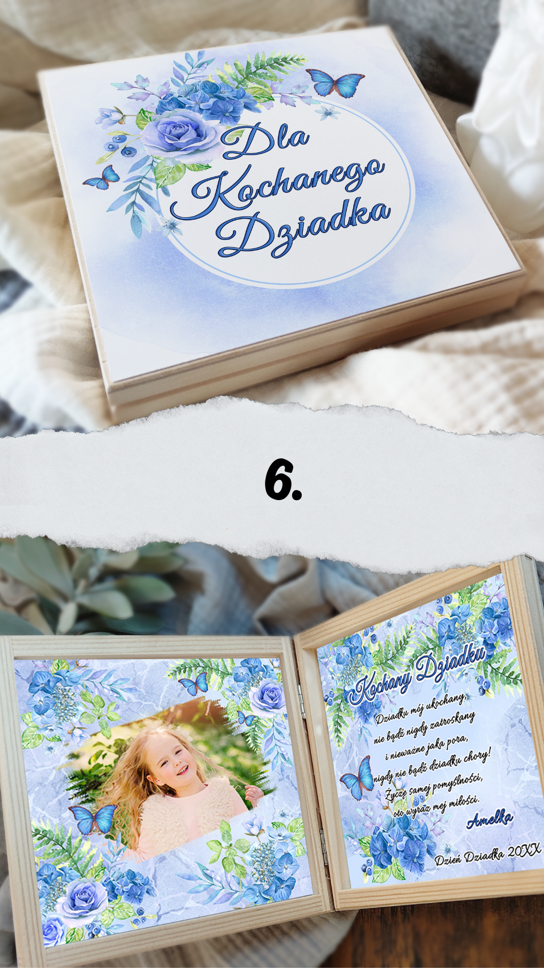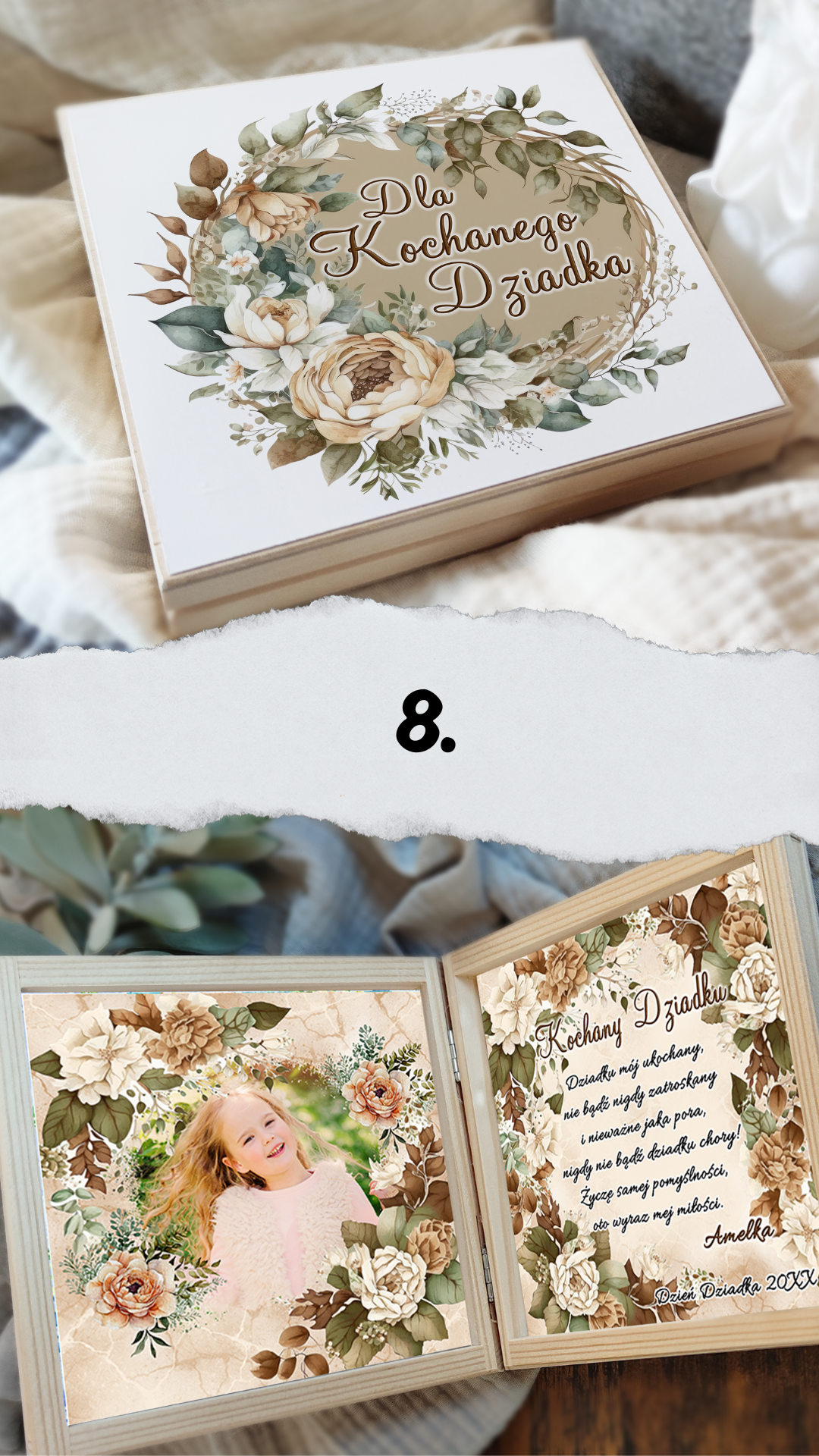 Podaruj swoim ukochanym Dziadkom coś więcej niż prezent — podaruj emocje zamknięte w drewnianej skrzyneczce pełnej ciepła i miłości. W środku znajdą wyjątkowe życzenia, które wzruszą, rozbawią i przypomną, jak bardzo są kochani. Każda skrzyneczka jest starannie wykonana, ozdobiona delikatnymi grafikami i personalizowana tak, by idealnie pasowała do Waszej rodzinnej historii.