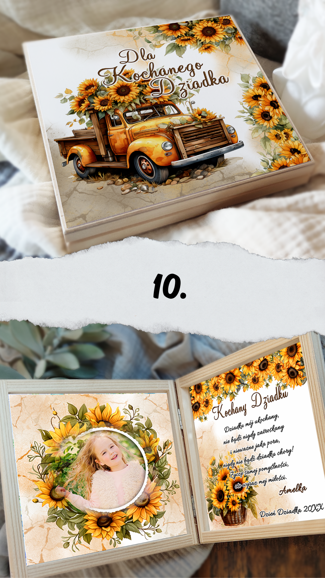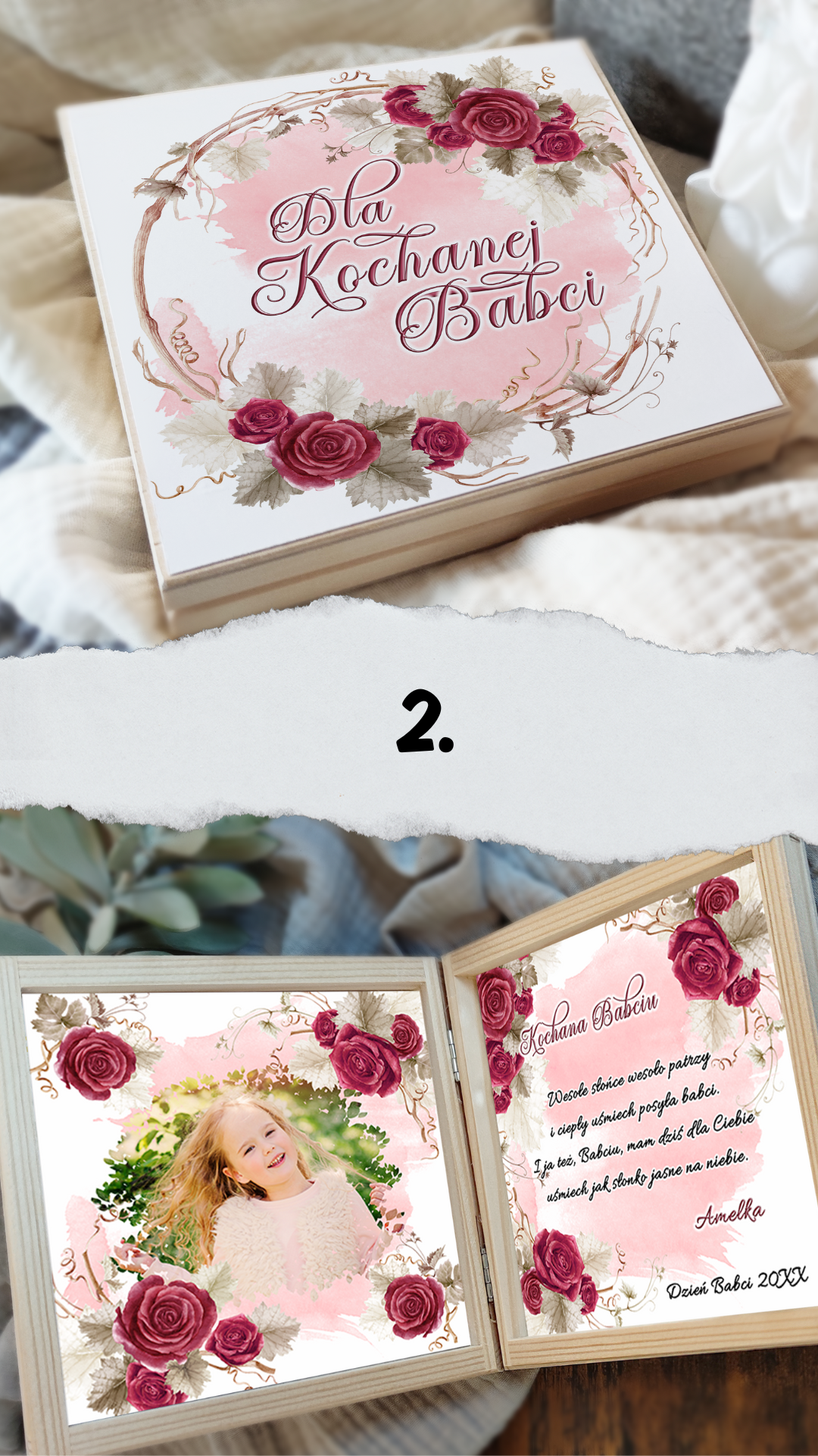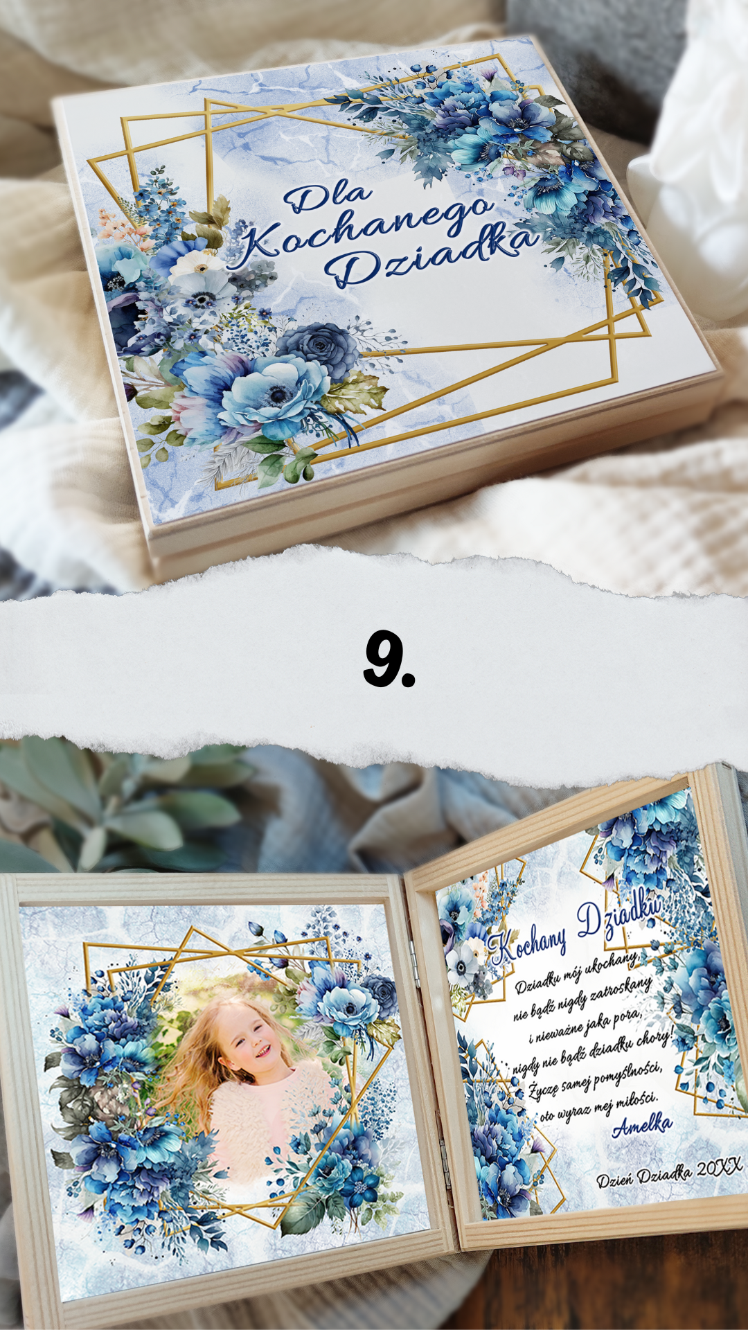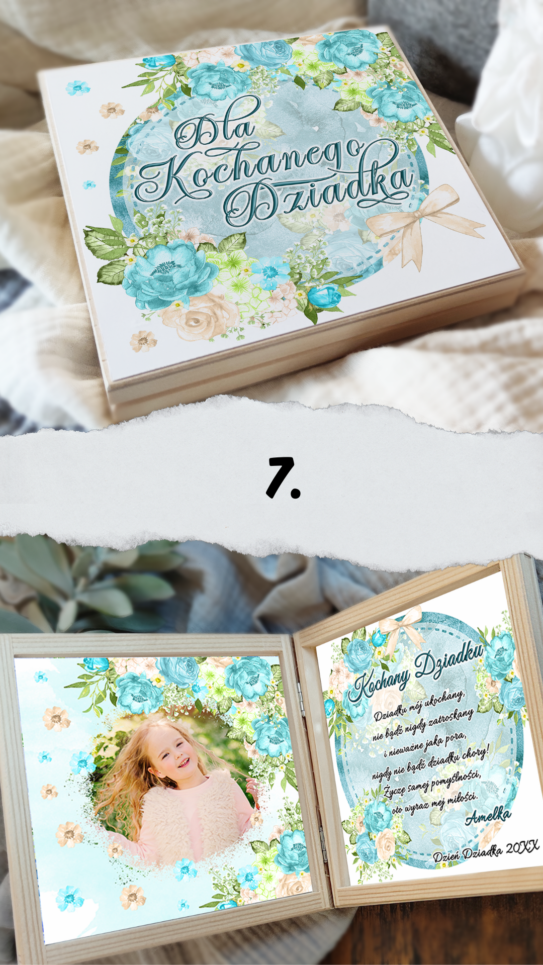 Podaruj swoim ukochanym Dziadkom coś więcej niż prezent — podaruj emocje zamknięte w drewnianej skrzyneczce pełnej ciepła i miłości. W środku znajdą wyjątkowe życzenia, które wzruszą, rozbawią i przypomną, jak bardzo są kochani. Każda skrzyneczka jest starannie wykonana, ozdobiona delikatnymi grafikami i personalizowana tak, by idealnie pasowała do Waszej rodzinnej historii.